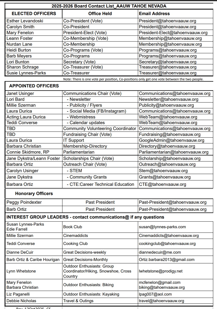 TAHOE-NEVADA AAUW BOARD MEMBERS 2025-2026