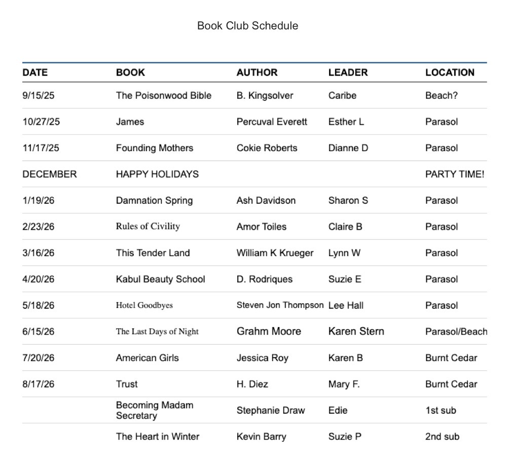 Each May, members recommend books; the group then votes to select books for the new season. Here are the books for 2026: