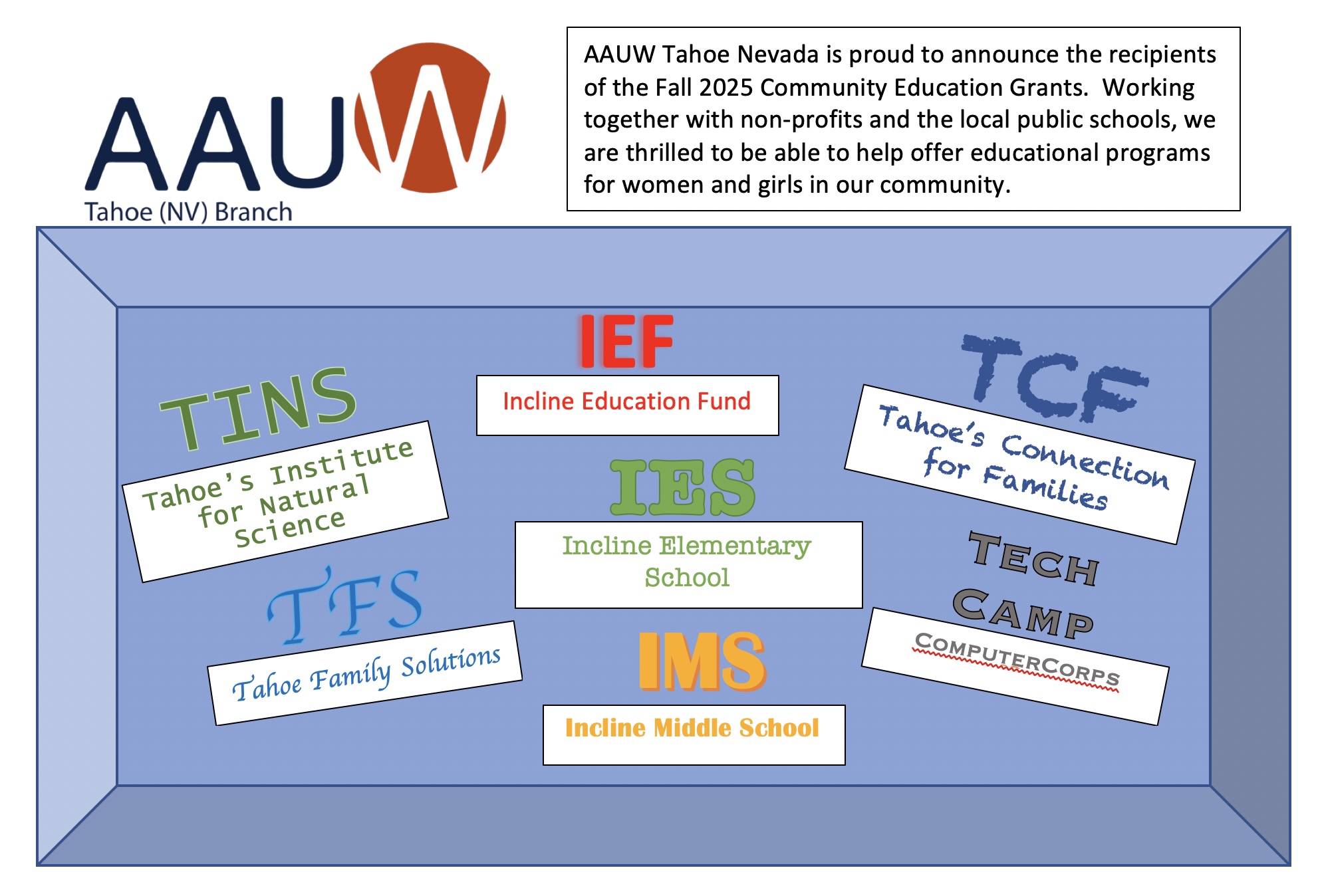 AAUW Tahoe Nevada approved $8,000 for the Community Education Grant Program for the Fall of 2025. The Board has approved funding to projects submitted by seven local non-profits and schools!